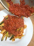 Topped with lasagna noodles, mozzarella cheese, tomato sauce, and ground beef.