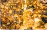 Fresh shrimp tossed with onions and scallions, sauteed in a brown sauce and topped with melted mozzarella cheese.